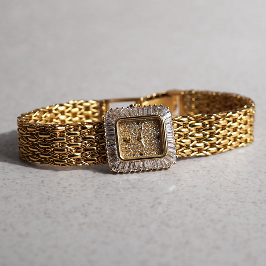 Audemars Piguet Bracelet Watch, Pavé diamond dial with Sapphire markers, Baguette diamond bezel, Yellow Gold