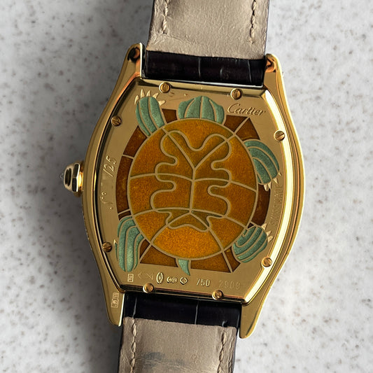 Cartier Tortue Watch with Champleve Enamel Turtle Motif, Yellow Gold