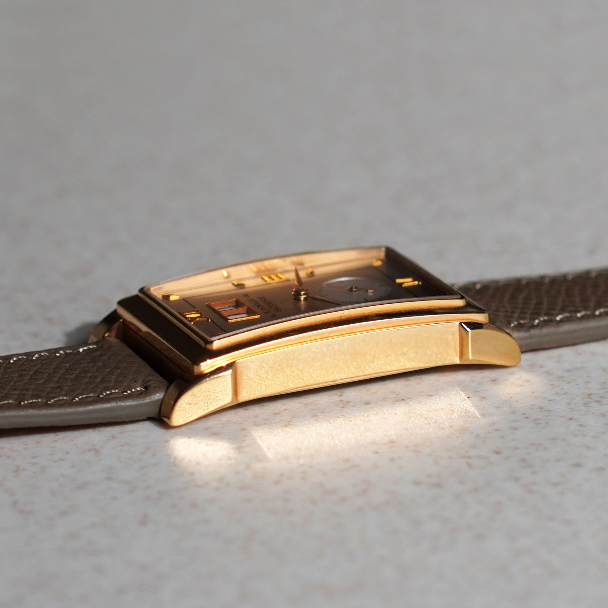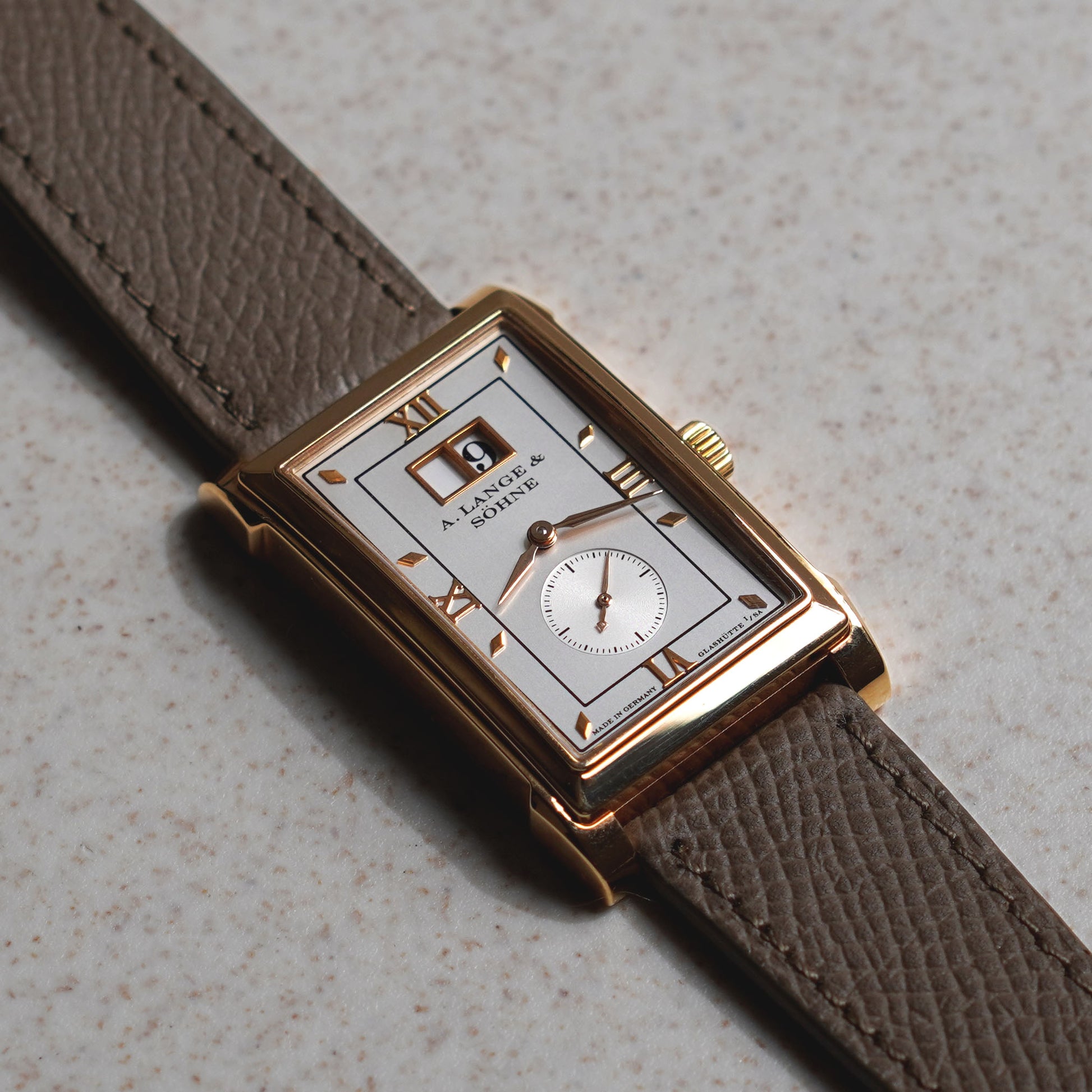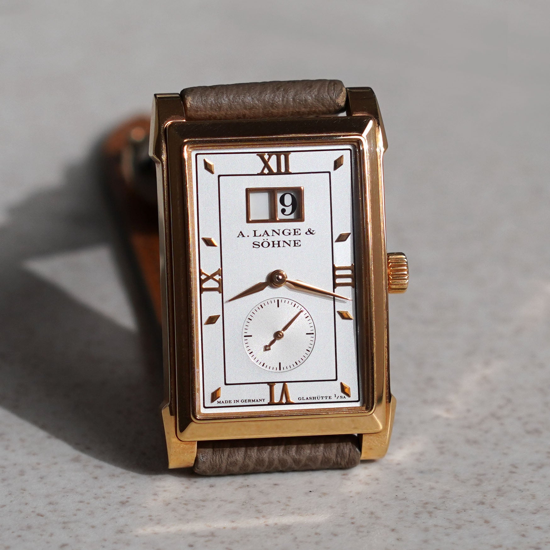 A. Lange & Söhne Cabaret, Ref. 107.032 — one of Lange’s few rectangular creations. Crafted in 18k pink gold, the 25.5mm x 36.3mm case frames a silver dial featuring an outsized date, applied Roman numerals, and subsidiary seconds at 6 o’clock. At its heart beats the manual winding caliber L931.3, which has a 42‑hour power reserve and is beautifully showcased through the sapphire caseback. Fitted with an 18k gold tang buckle and circa 2000s, this Cabaret is a rare departure from Lange’s predominantly round designs and remains a sought‑after piece among collectors. |