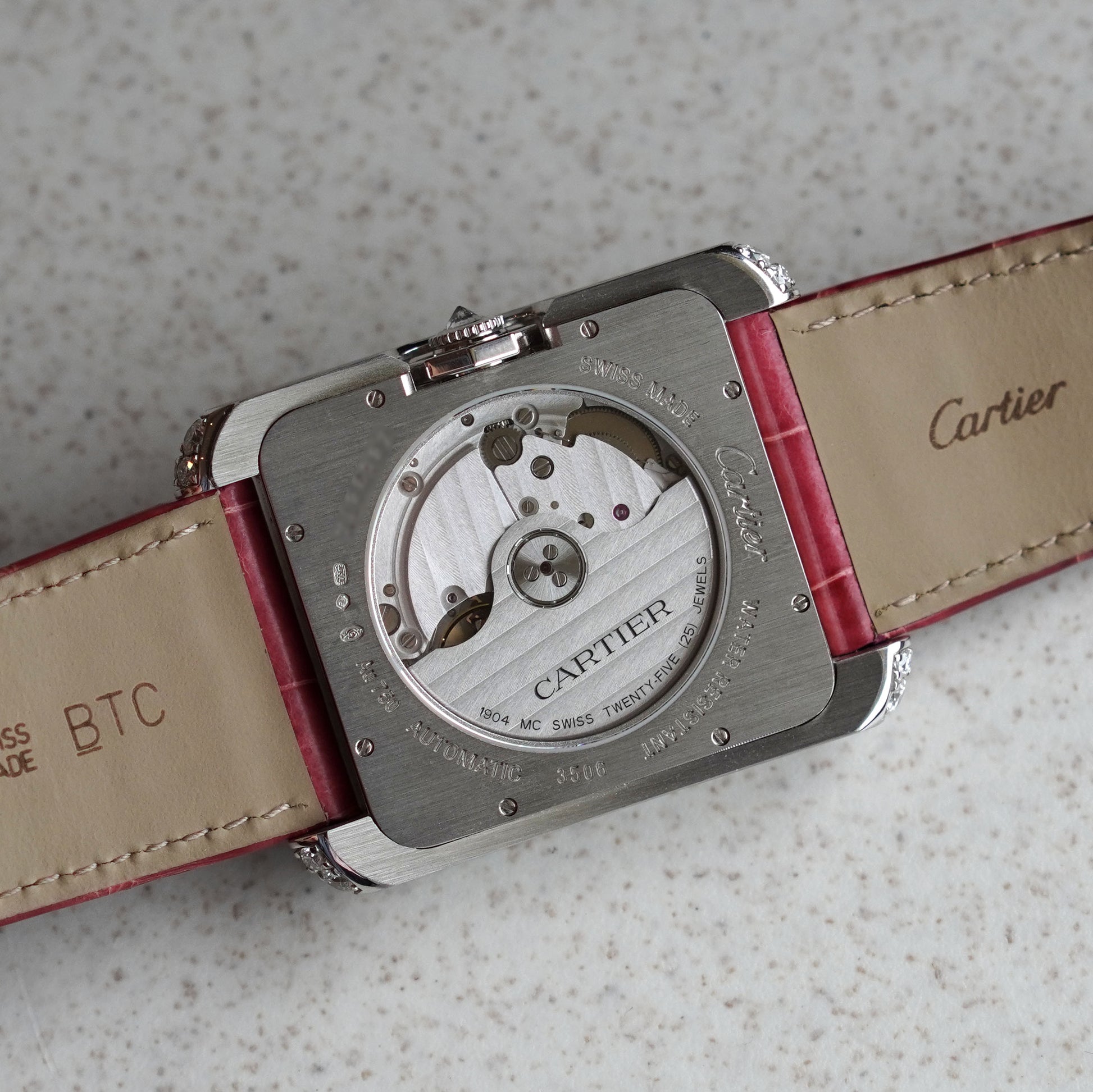 The case measures 36.5mm wide x 47mm long. Its bezel features two rows of Cartier factory diamonds and a cut-out to nest the octagonal-shaped crown set with a Cartier factory diamond. Turned over, the case back has a sapphire glass window with a view of the self-winding mechanical movement, calibre 1904 MC.