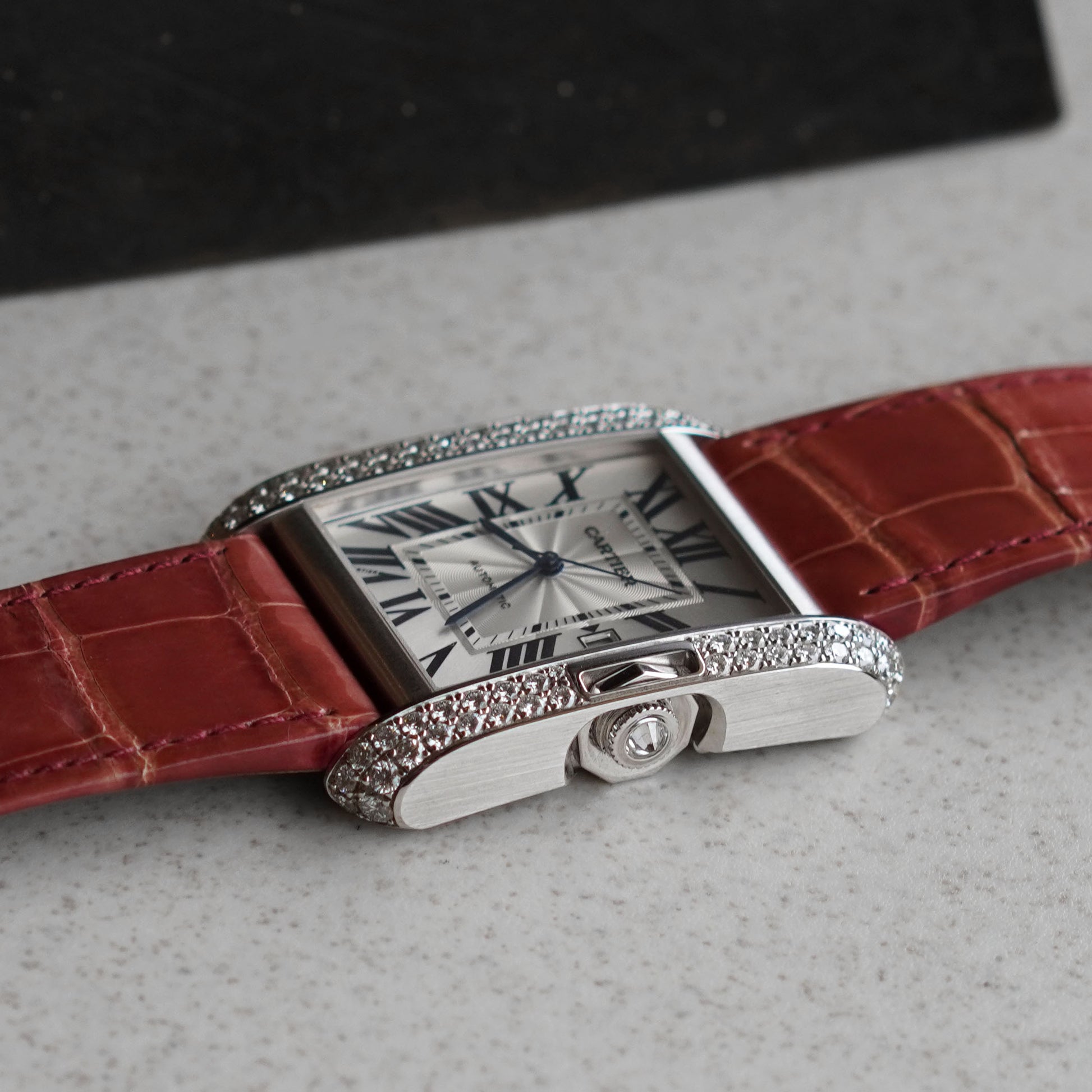 A new old stock Cartier Tank Anglaise XL in 18k white gold with Cartier factory diamond bezel. Ref. WT100023. This self-winding wristwatch features a silvered dial with large and radial Roman numeral hour markers, a minute track at the centre and a date aperture at 3 o’clock. A closer look reveals a lovely detail on the dial whereby the hour and minute tracks are slightly raised above the guilloché decoration.