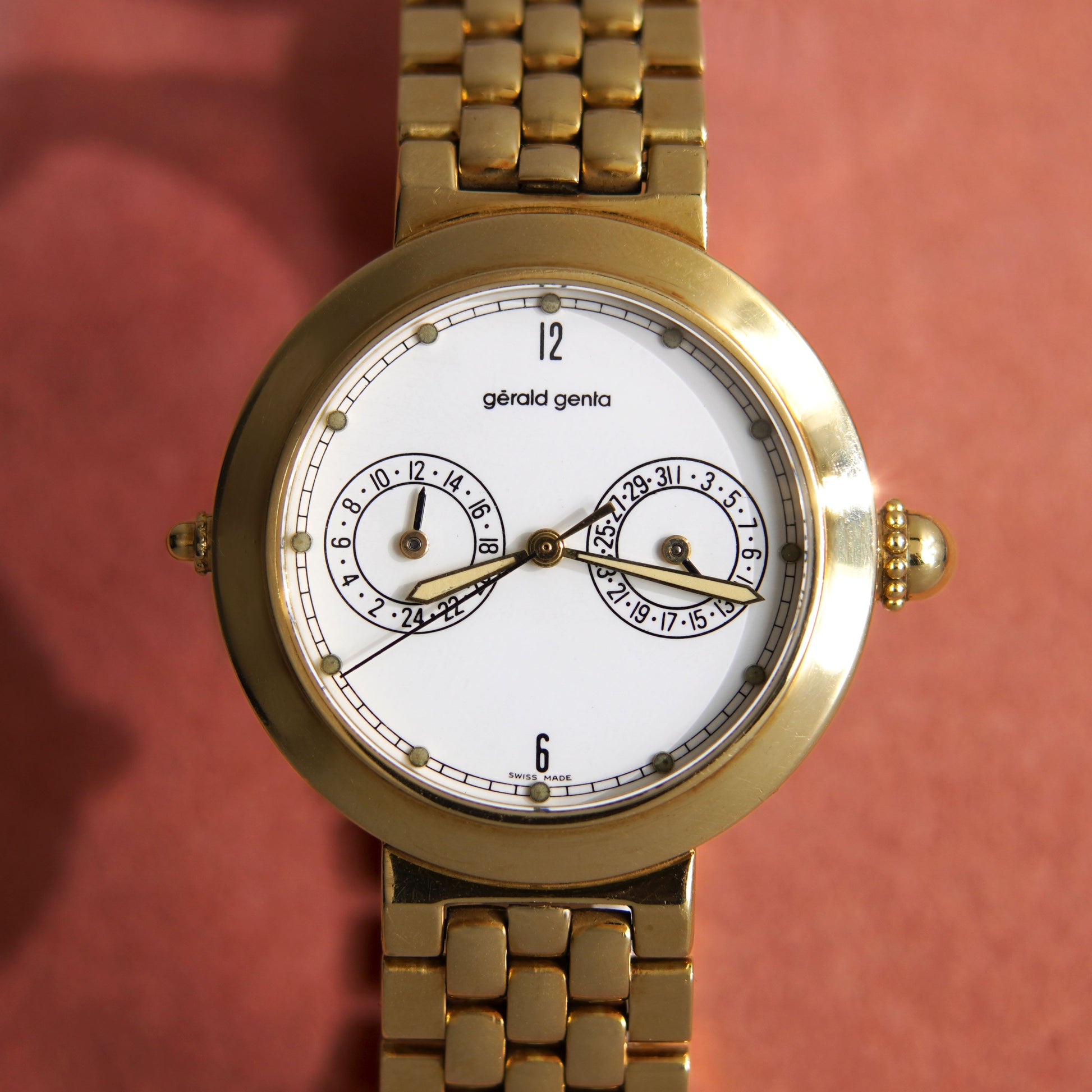 A Gerald Genta GMT Date, Ref. G3506.7, crafted in 18k yellow gold and weighing an impressive 148 grams. The white dial is elegantly arranged with two subdials: a date display at 3 o’clock and a second time zone at 9 o’clock, with luminous hour plots set along the minute railway track. Measuring 36mm wide, the case is fitted with a smooth bezel and houses an automatic movement. Circa 1990s. |