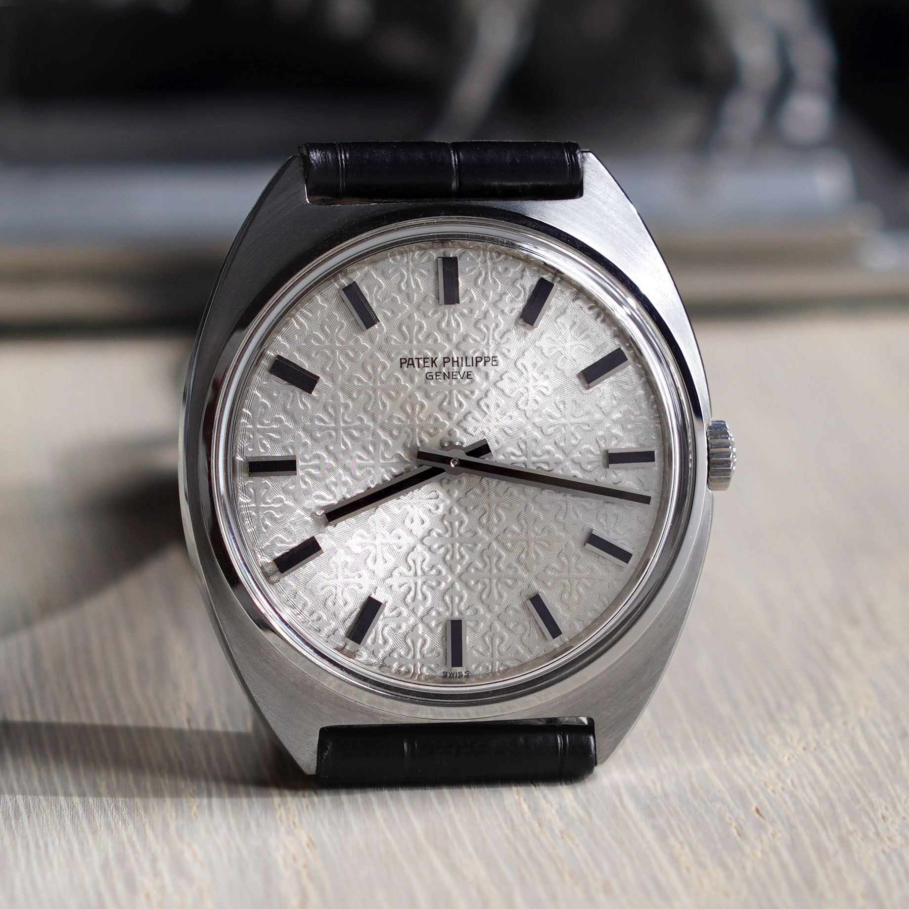 | A rare stainless steel Patek Philippe Calatrava, Ref. 3574, produced for less than five years with no more than a few hundred pieces made. It has a beautiful silvered guilloché dial featuring a distinctive and highly desirable “Calatrava cross” pattern. The tonneau-shaped case, measuring 35mm x 40mm, has a screw-back and houses the manual-wind Calibre 23-300 PM. This watch comes on an original Patek Philippe strap with a steel tang buckle. Circa 1970s. | |