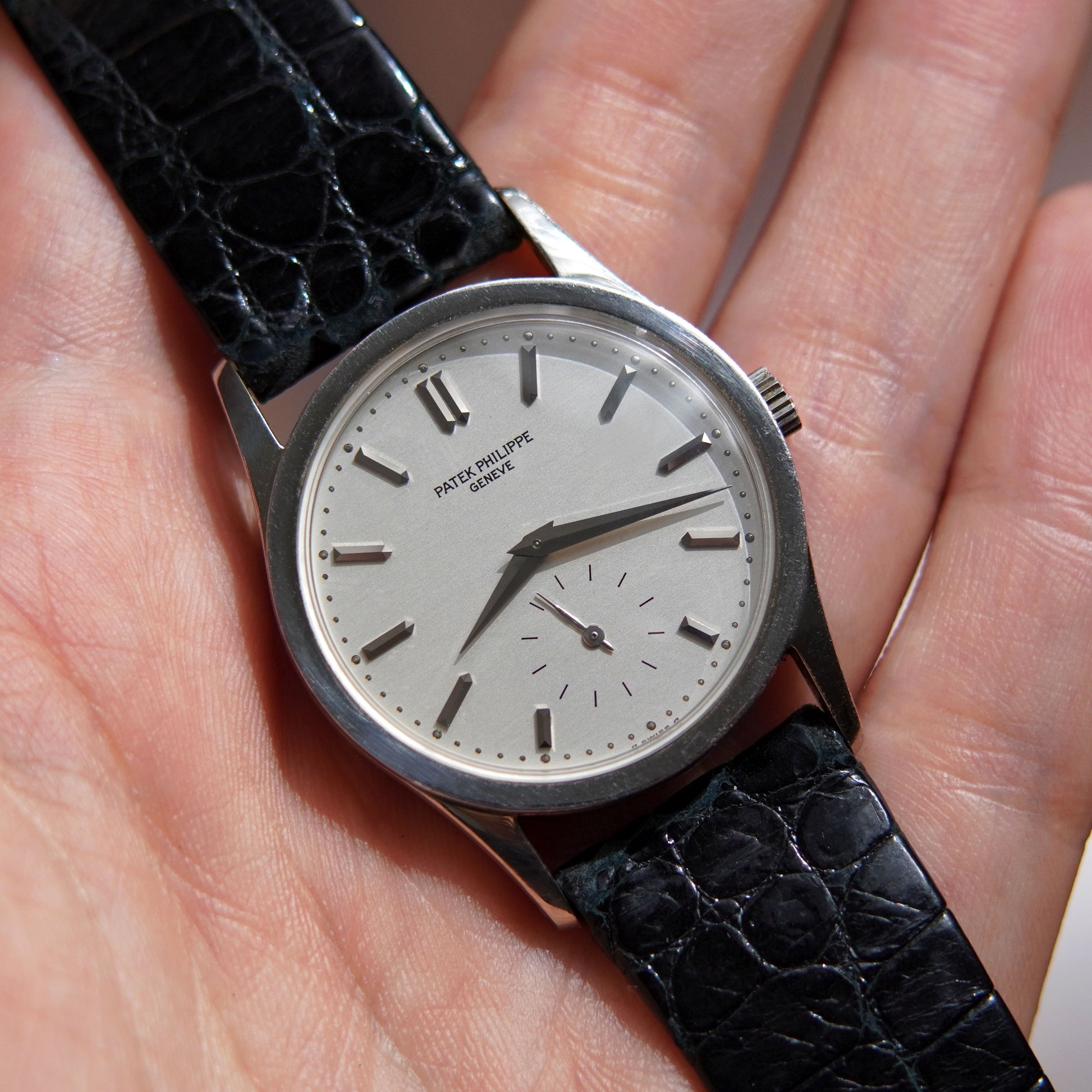 A beautifully preserved Patek Philippe Calatrava Ref. 3796P in 950 platinum. This classic dress watch embodies the refined simplicity that has defined the Calatrava line since the original Ref. 96. The silver dial features faceted indices, an applied dotted minute track, dauphine hands, and subsidiary seconds at six o’clock. Measuring 31 mm across, the case is compact in size yet its slightly elongated lugs extend its proportions, giving the watch a presence on the wrist that feels larger than expected. This example retains sharp hallmarks, attesting to its excellent condition. Powered by the manual‑wind Caliber 215 PS. This example comes fitted on a Patek Philippe leather strap and PT950 tang buckle. Circa 1990s.