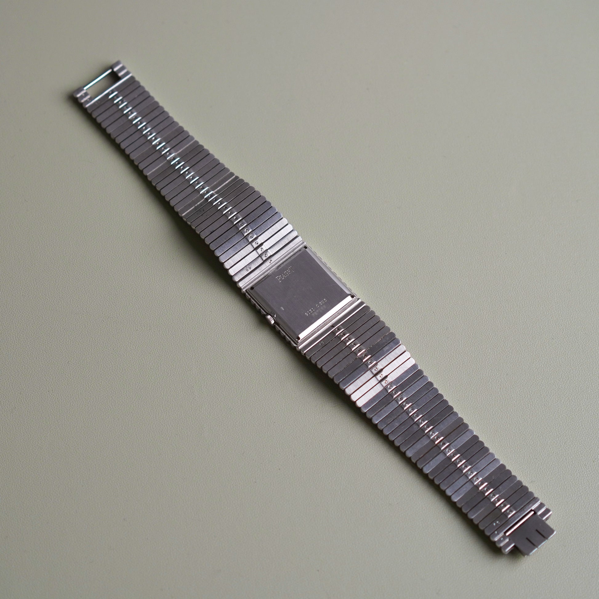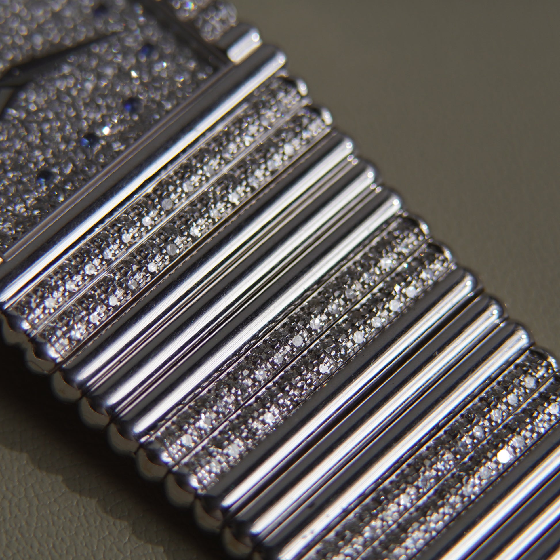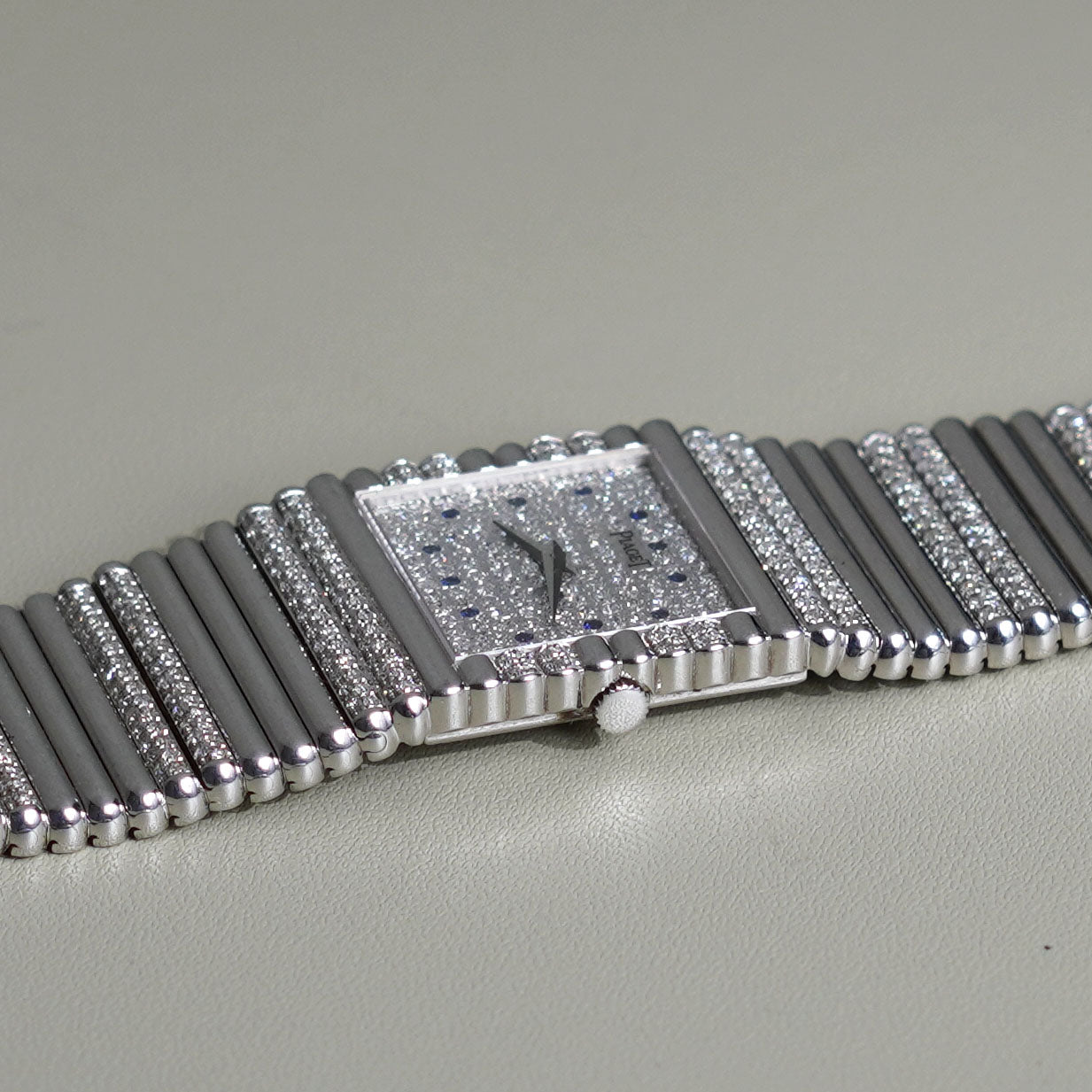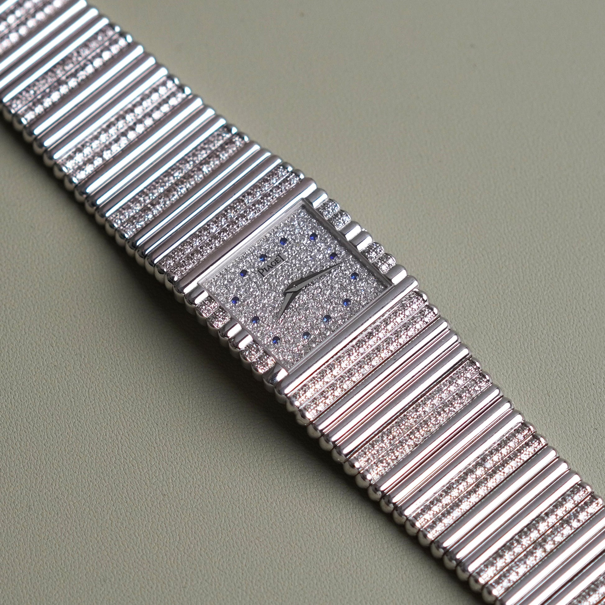 This Piaget Emperador, Ref. 9131C505, is in exceptional condition, crafted in 18k white gold featuring a factory-set pavé diamond dial with sapphire hour markers. The 25mm case and integrated bracelet feature alternating rows of factory diamonds and solid gold rods—an intricate and luxurious pattern. Manual wind, and a solid 151g on the wrist.