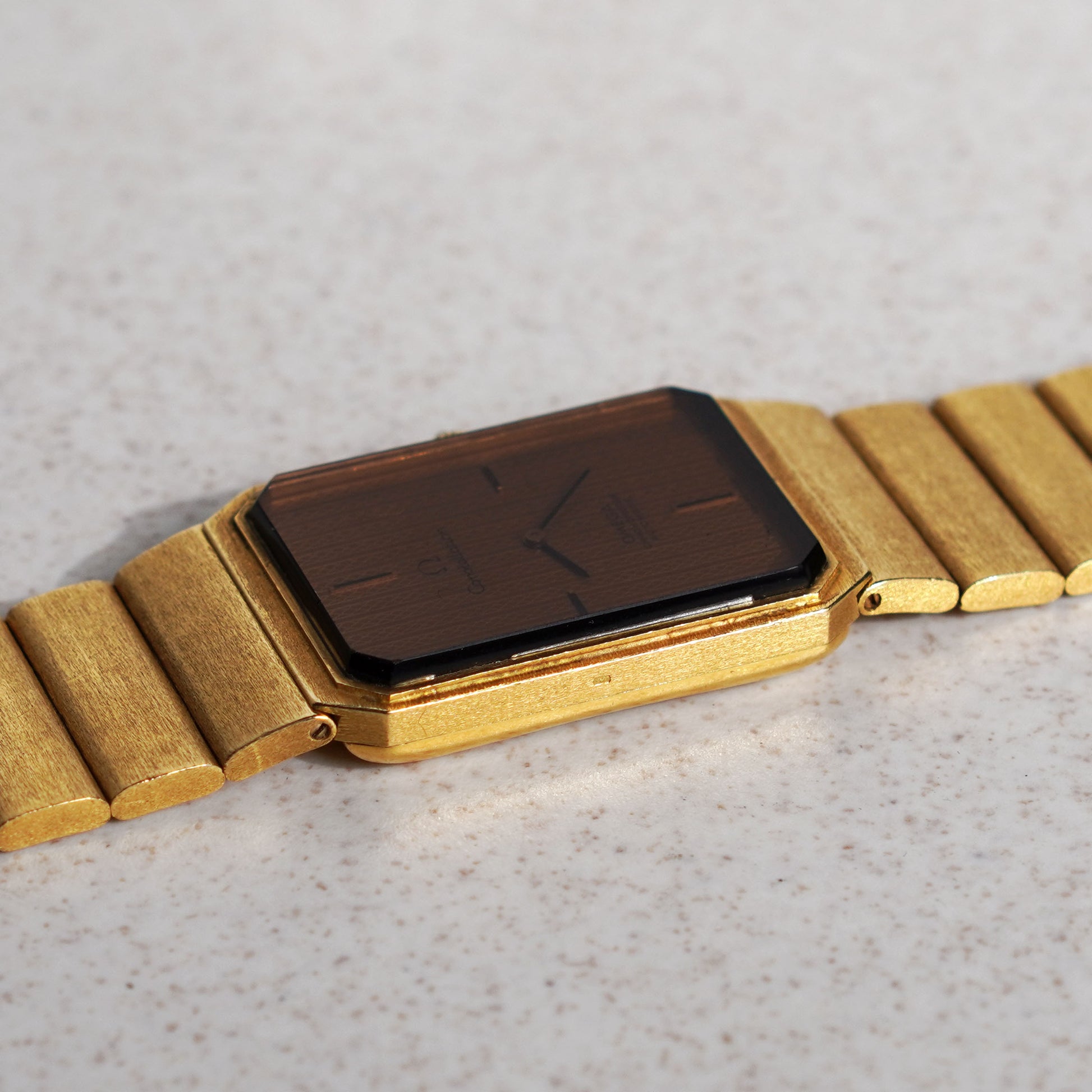 A rare 1970s Omega Constellation Chronometer, Ref. 8310, inspired by Andrew Grima’s “About Time” collection. Its bold 8-sided case is crafted from 18k yellow gold and paired with a smoky faceted crystal that refracts light like a gemstone — striking, architectural, and rich in Grima’s design DNA.