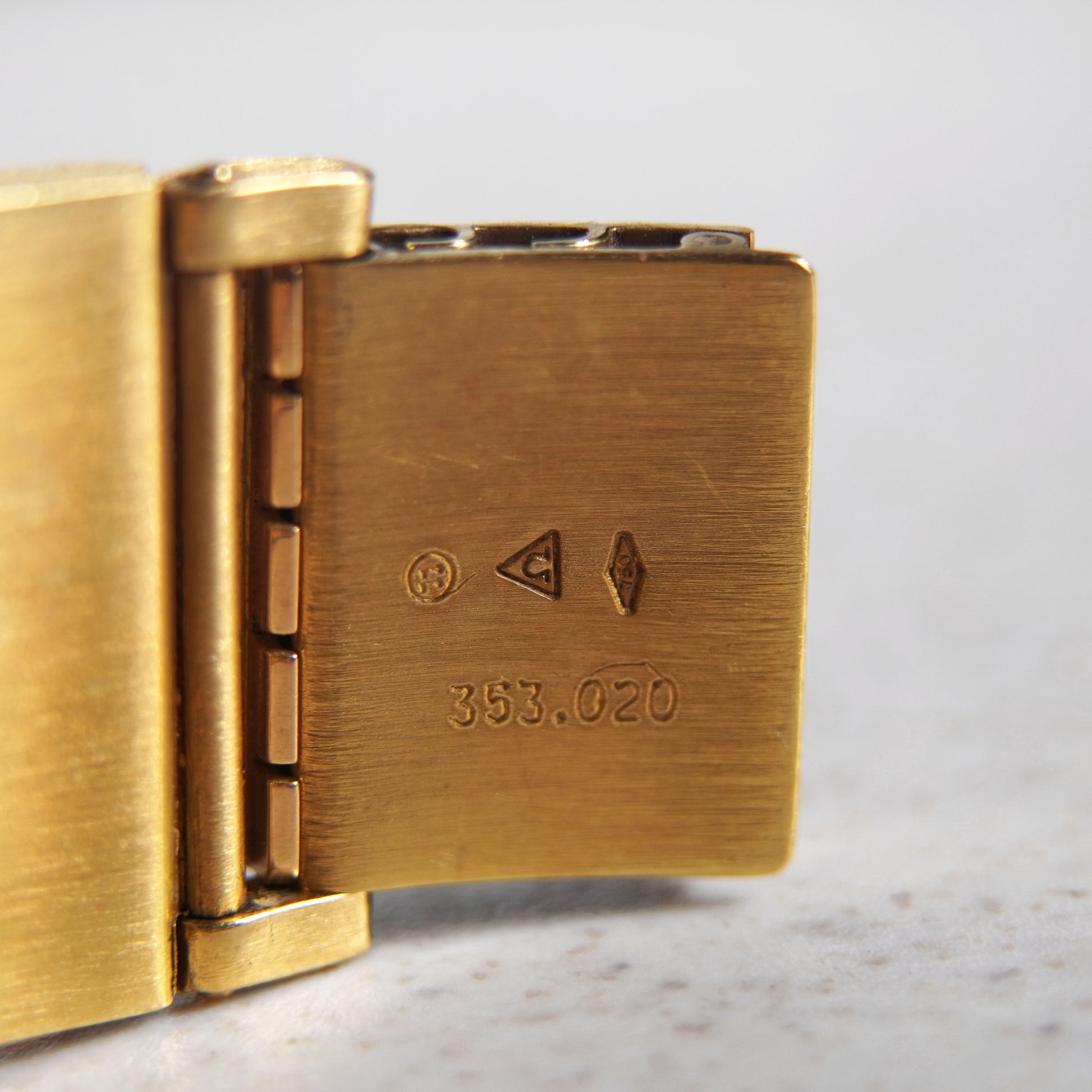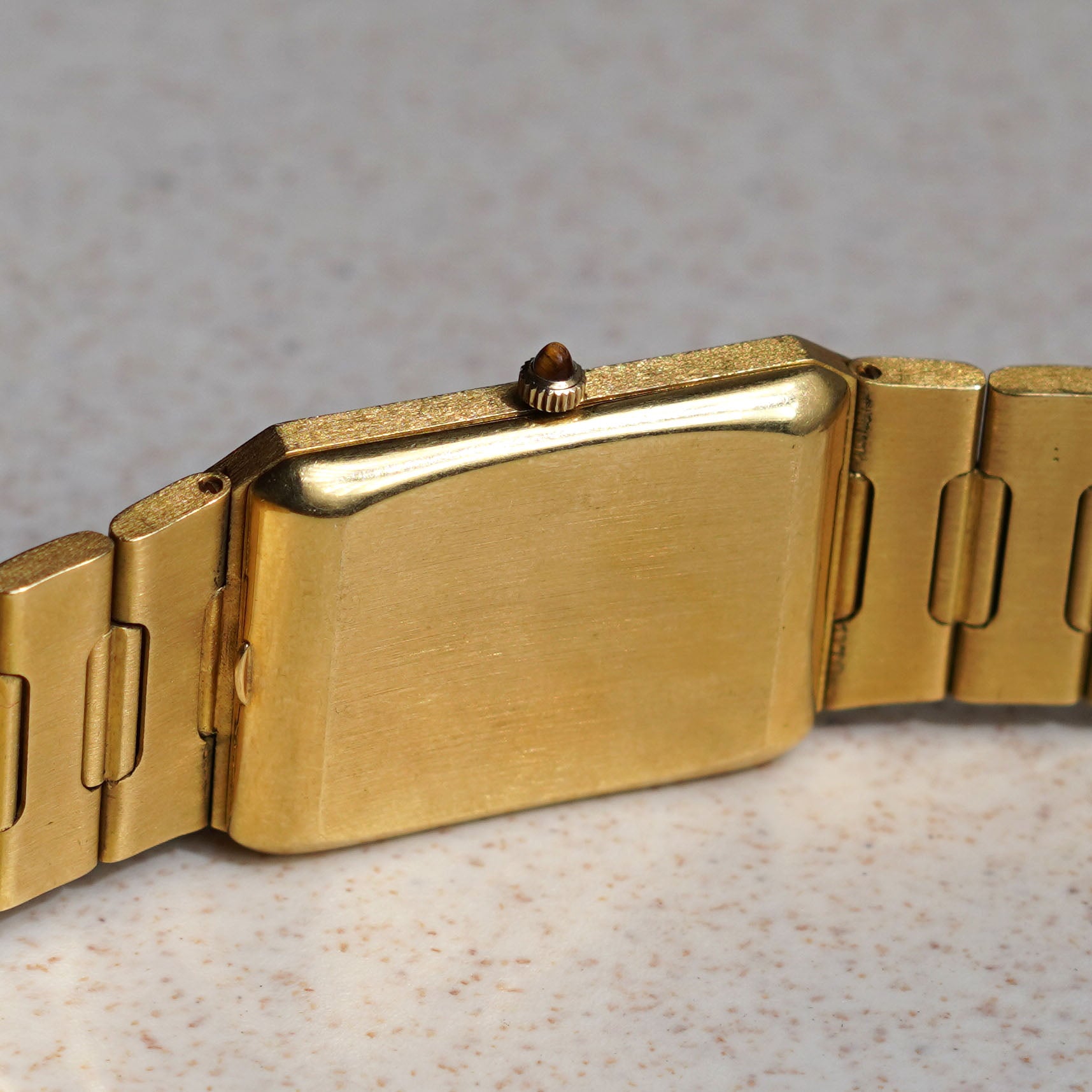 Beneath the crystal lies a gold-hued dial with tapestry detailing and slim black indexes. The integrated bracelet, also in 18k yellow gold, features thick bar links that echo the watch’s bold geometry. To top it all off, the winding crown is carved from natural Tiger’s Eye stone.
