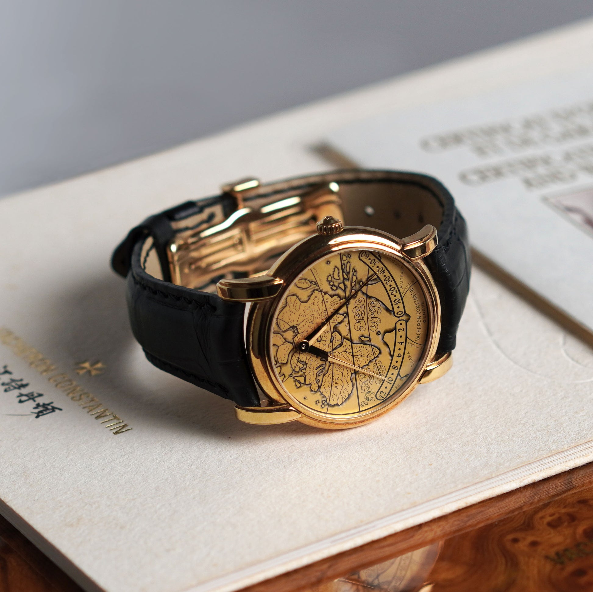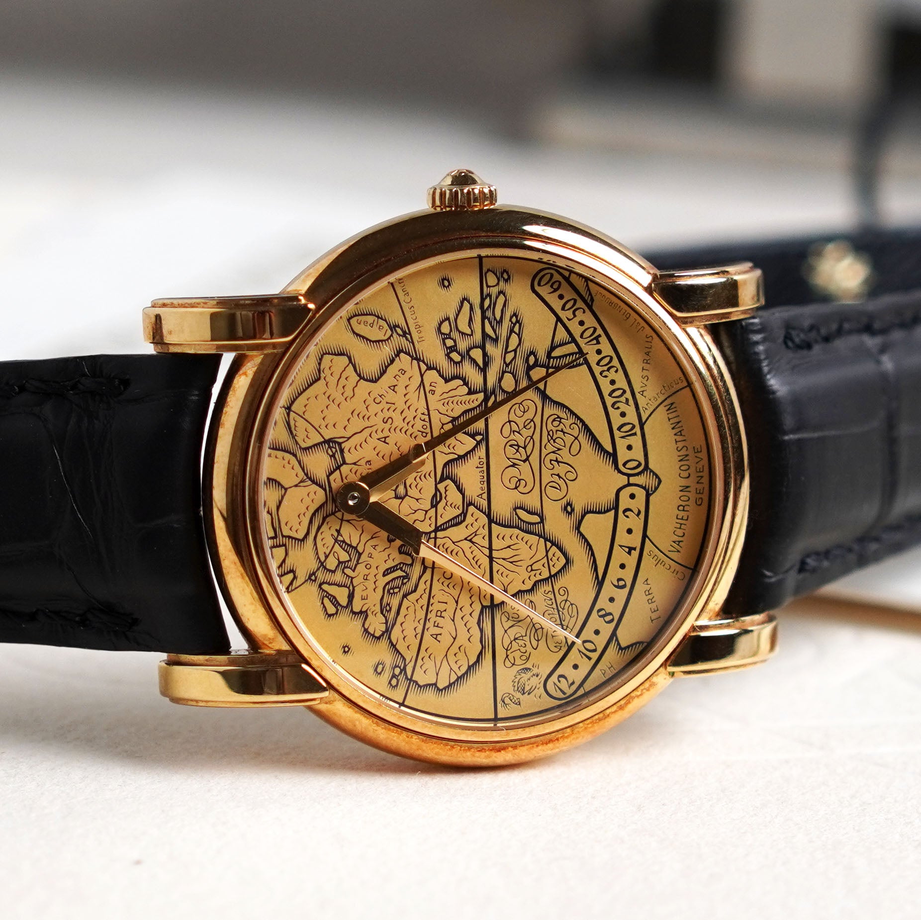 This Vacheron Constantin Mercator Ref. 43050/000J is crafted in 18k yellow gold and features a solid gold dial engraved with a map of Europe, Asia, and Africa. Twin retrograde hands — shaped like compass needles — display the time along two arcs: minutes on the right, hours on the left.
